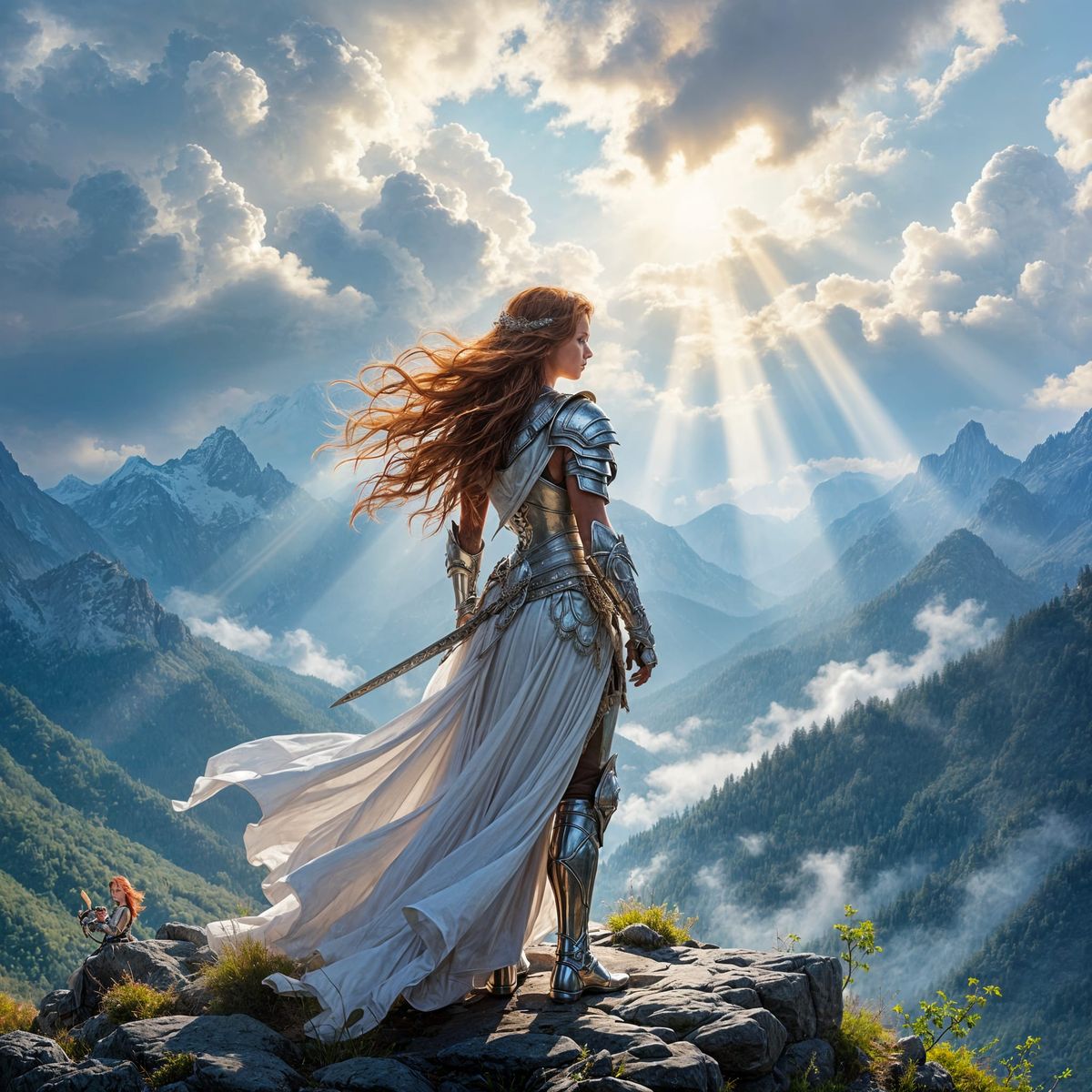 This image shows a majestic warrior princess with auburn hair and silver armor on a mountain peak, overlooking an enchanted forest. Dramatic sunlight breaks through storm clouds, rendered with impressionistic brushwork and photorealistic detail.