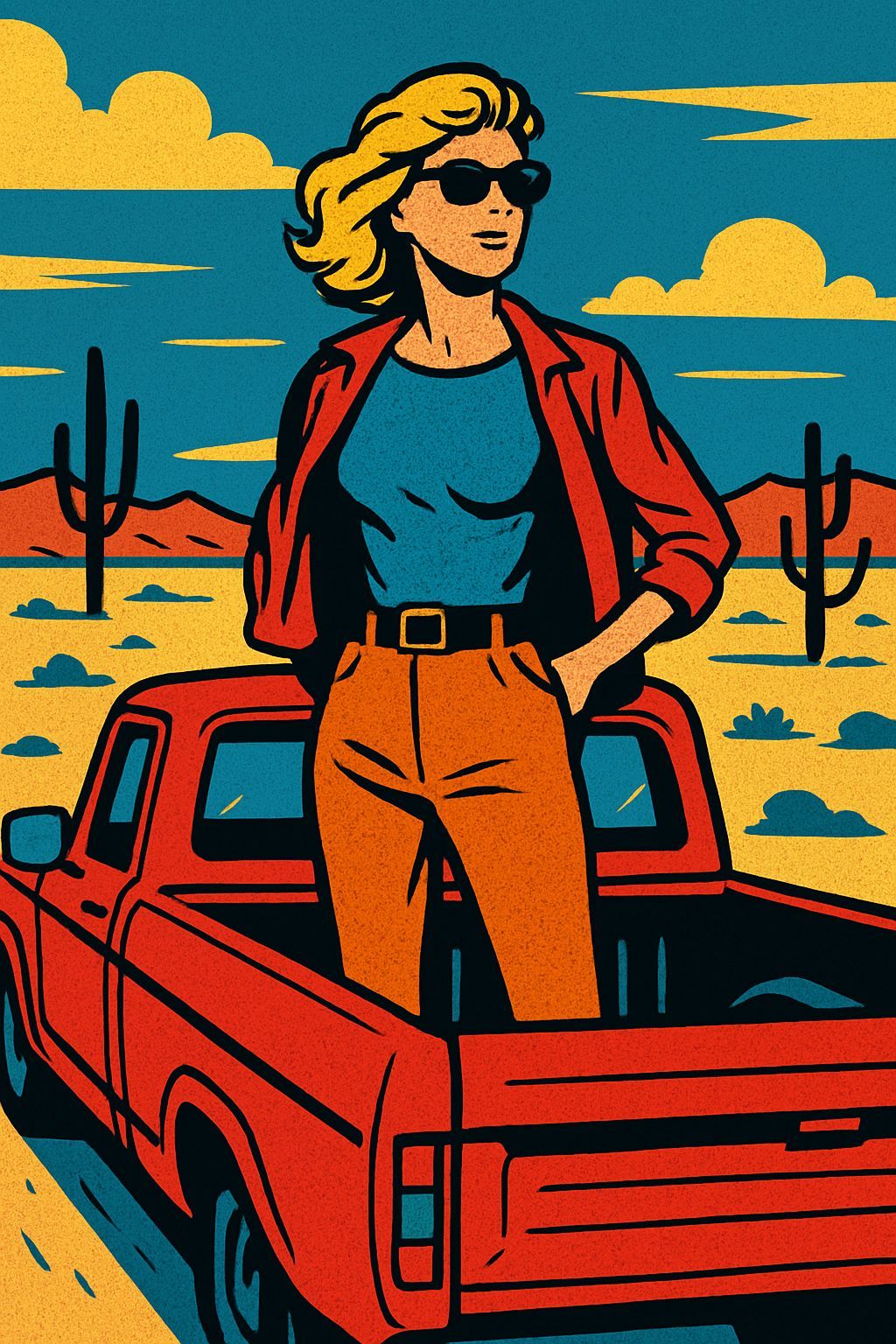 This image depicts a woman standing in the back of a pickup truck in a desert landscape, rendered in a stylish pop art painting aesthetic.