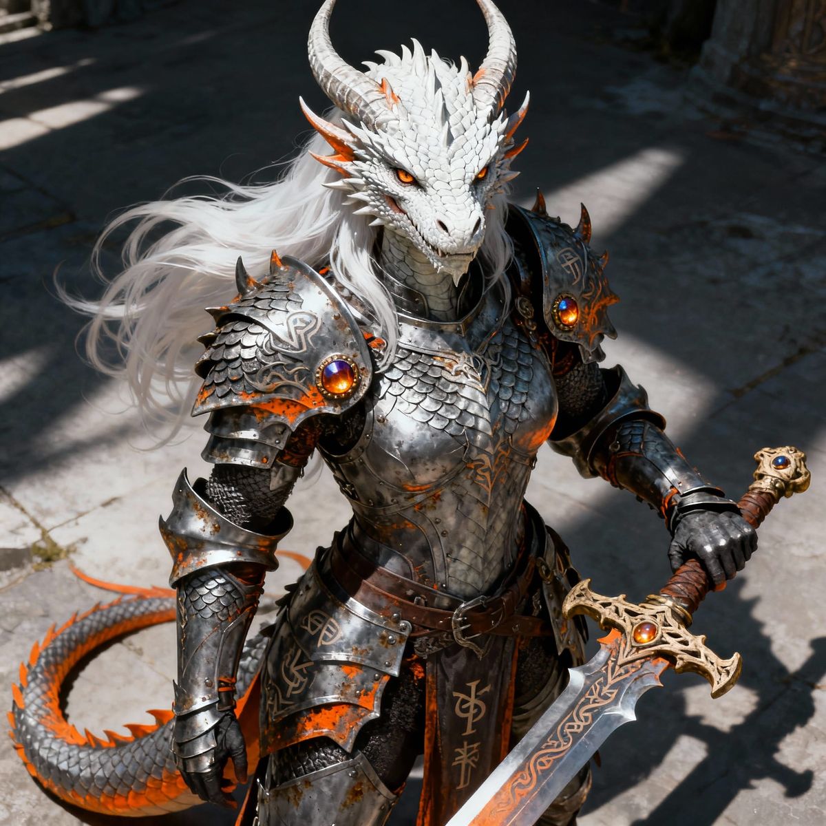A detailed fantasy portrait of a white-scaled dragon warrior princess in medieval-inspired armor. Her art style emphasizes intricate textures and fine details of scales and armor.