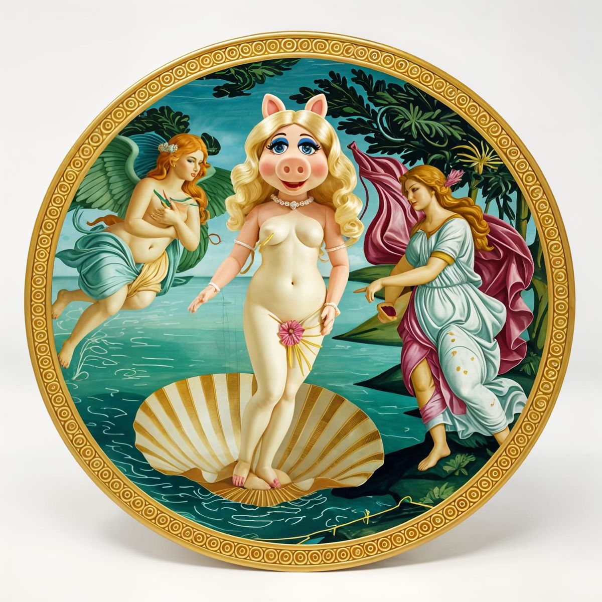 This image depicts Miss Piggy reimagined in the iconic "The Birth of Venus" painting, offering a whimsical and artistic interpretation of the classic artwork.