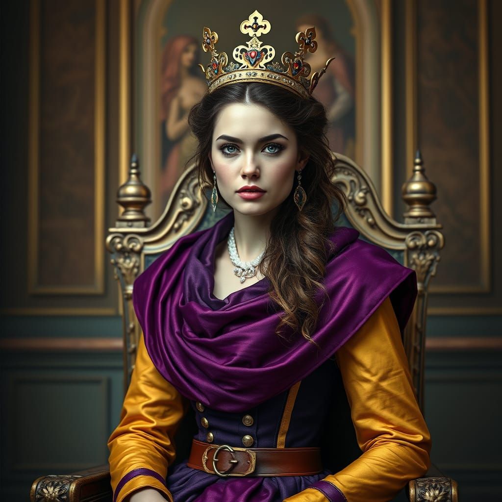 This image shows a stunning hyper-realistic portrait of a regal princess sitting on a throne, wearing a gold and silver crown, surrounded by opulent royal purple attire and a capelet, evoking a sense of 19th-century Hungarian hussar elegance