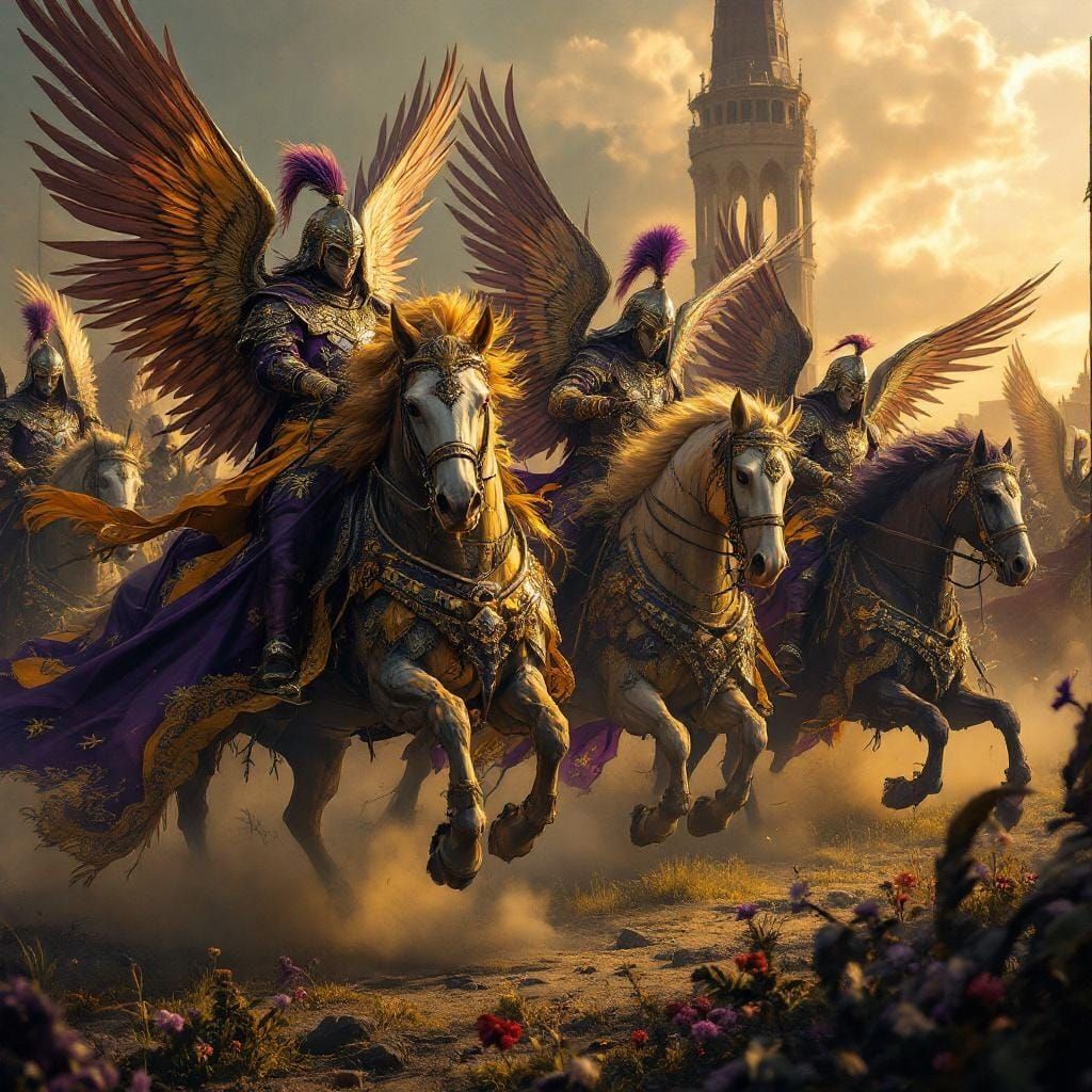 A vivid image depicting Winged Hussars on horseback during the liberation of Vienna. The artwork features dynamic lighting, hyperdetailed textures and ornate flair in a dark fantasy style.