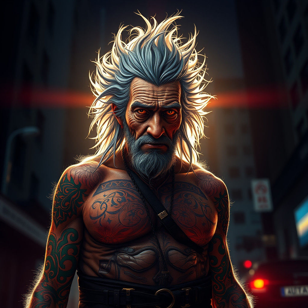 A striking picture of an old man with long hair and tattoos silhouetted against a streetlight. The image blends gritty realism with a high fantasy aesthetic, rendered with detailed concept art in 8k.