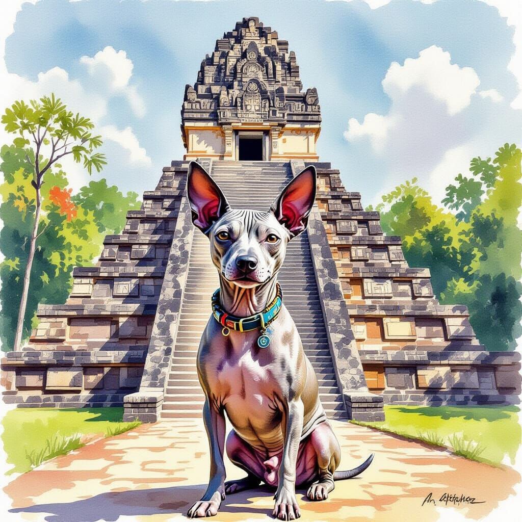 This image shows a Mexican Hairless Dog in front of a Mayan temple. The artwork uses realistic watercolor techniques to capture the scene's details.