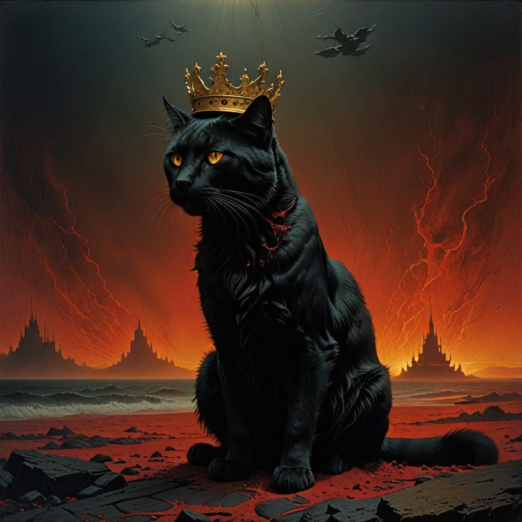 This cinematic film still features a majestic cat wearing a gold crown, set against a dark, blood-red backdrop. Moody, high-contrast lighting and rich, textured details evoke a sense of drama and atmosphere, inspired by the dark, industrial art of H.R. Giger and Zdzisław Beksiński.