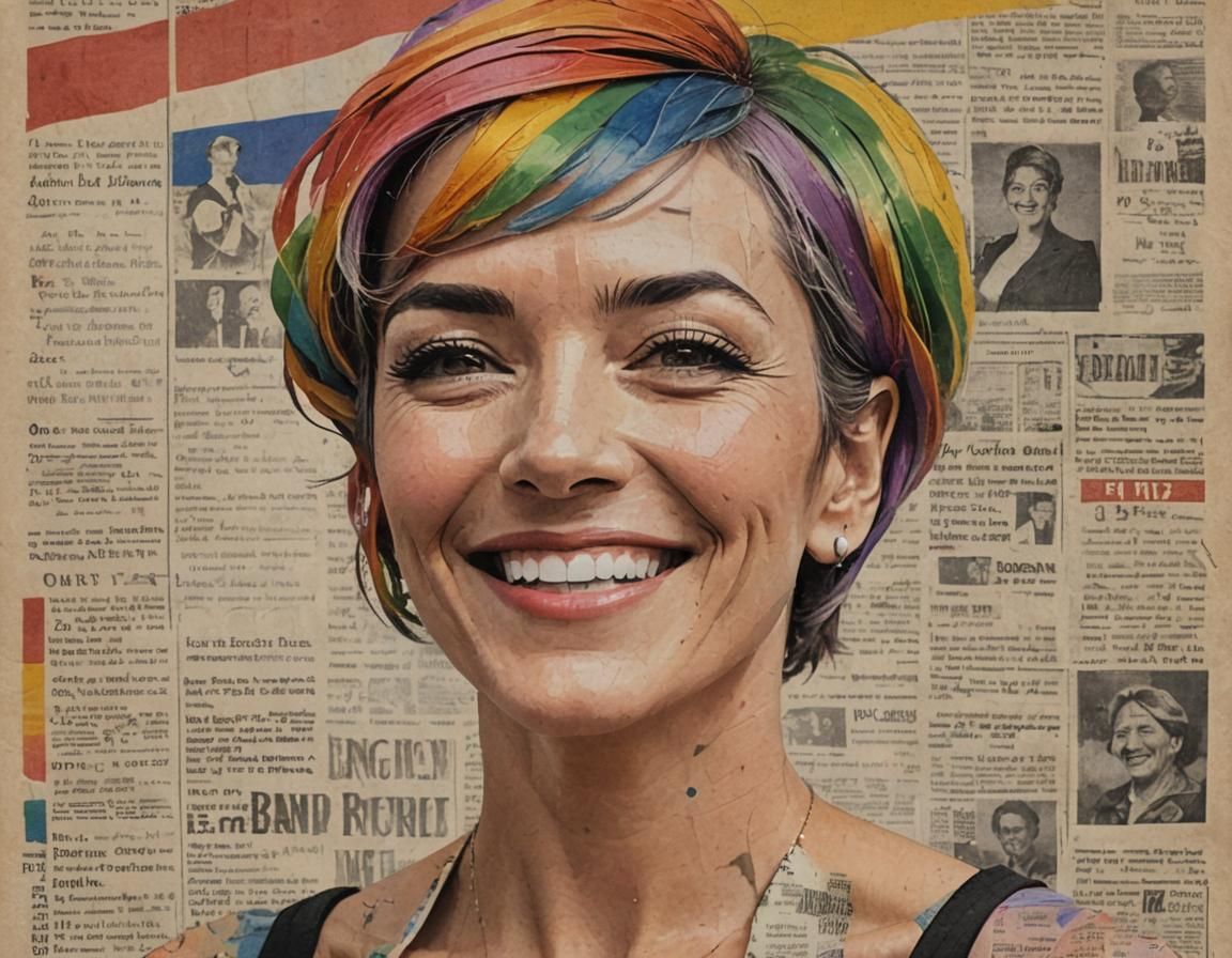 A vibrant portrait of a smiling woman with colorful short hair. In the background, an antique newspaper design complements a rainbow flag that gracefully drapes from her head.
