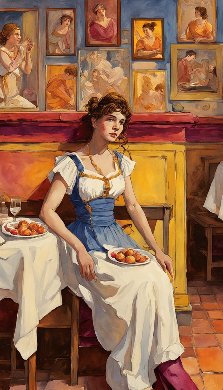 Generate your own classical depictions of women in Greco-Roman costumes, inspired by ancient frescos. Free and easy to use!