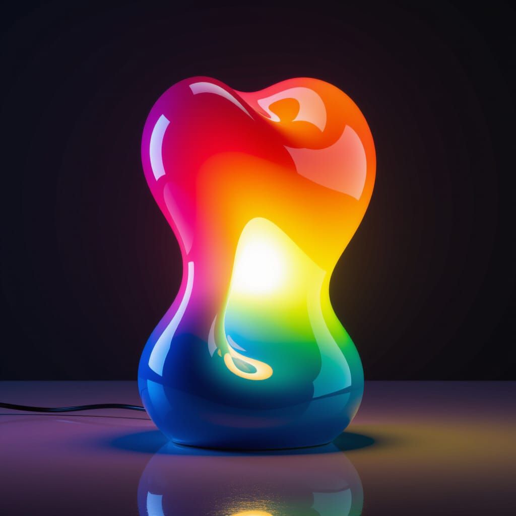 This image shows a vibrant, rainbow-colored bedside lamp with a biomorphic shape. The lamp is made of glossy resin and set against a dark, reflective backdrop with surreal melting effects in a surrealist style.