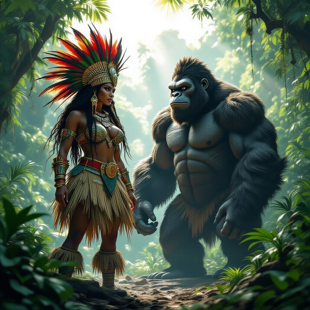 This image depicts a colossal woman and a massive ape on a vibrant jungle island. Dynamic lighting and volumetric rays emphasize their immense scale and the detailed textures of this hyperrealistic concept art scene.