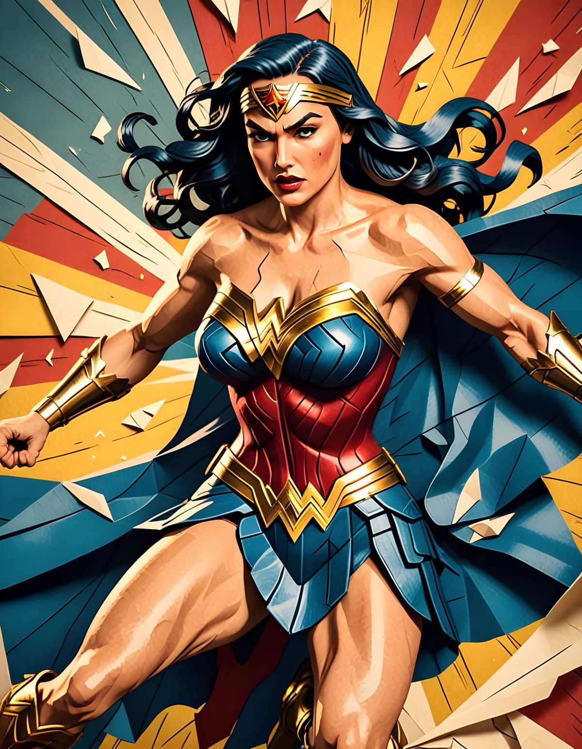 This image depicts a stylized, papercraft Wonder Woman in a dynamic action scene, reminiscent of classic comic book illustrations from the Golden Age.