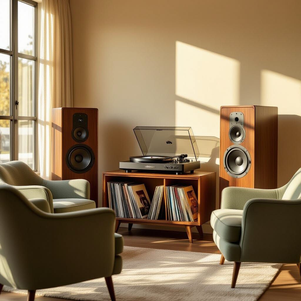 Interior photography showcasing a vintage music corner with a record player, vinyl records, and stylish speakers in a modern studio lounge. Features comfortable seating and warm, golden light.