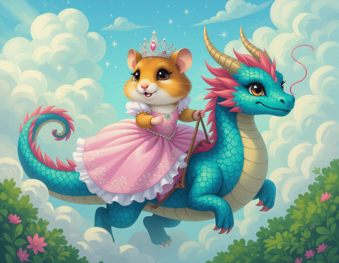 This image shows a hamster princess wearing a tiara and gown, riding a blue dragon amidst clouds and greenery. The artwork evokes the style of fantastical creature art with vibrant colors.