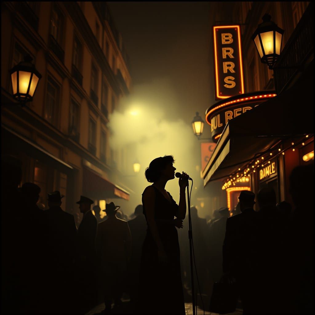 A bustling 1920s Parisian street scene, rendered with the gritty texture of vintage film noir. A lone singer, silhouetted against a smoky cabaret backdrop, belts out a melancholic tune. The lighting is dramatic, with sharp shadows and highlights, creating a sense of mystery and longing. The style combines elements of cinematic realism with a touch of abstract expressionism in the background.