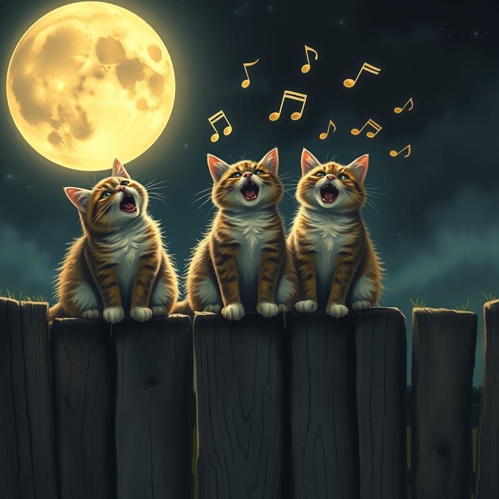 This enchanting image captures three cats serenading the full moon with a hauntingly beautiful chorus, surrounded by whimsical sheet music notes and dramatic, gothic shadows, evoking the dark romanticism of Edgar Allan Poe and the surrealism of Mark Ryden's art