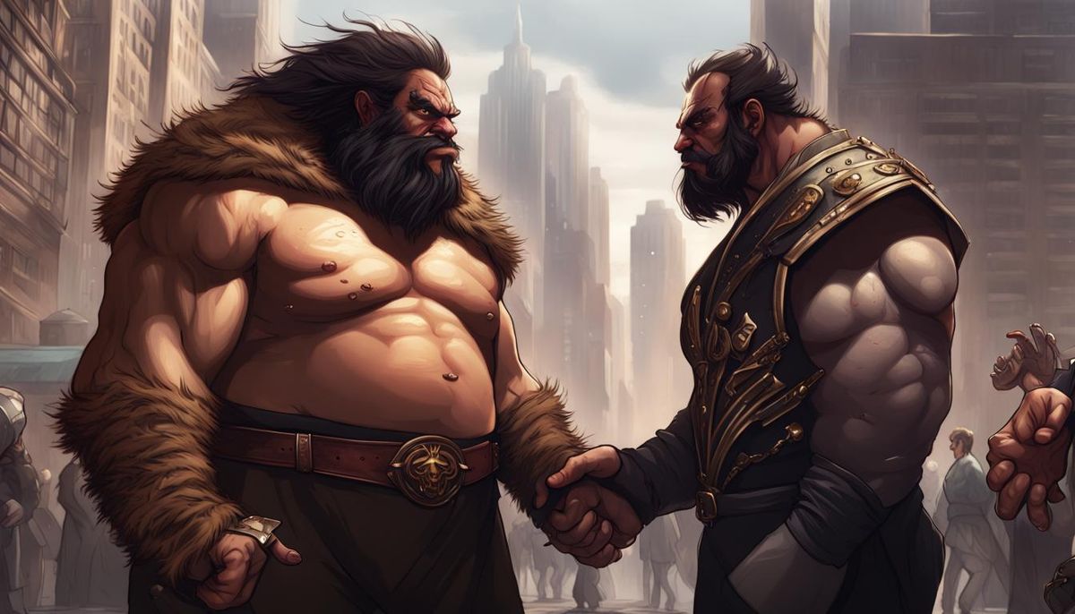 This image shows two characters about to fight in a city. The scene is rendered with dynamic lighting and intricate details, in a dark fantasy style reminiscent of splash screen art.