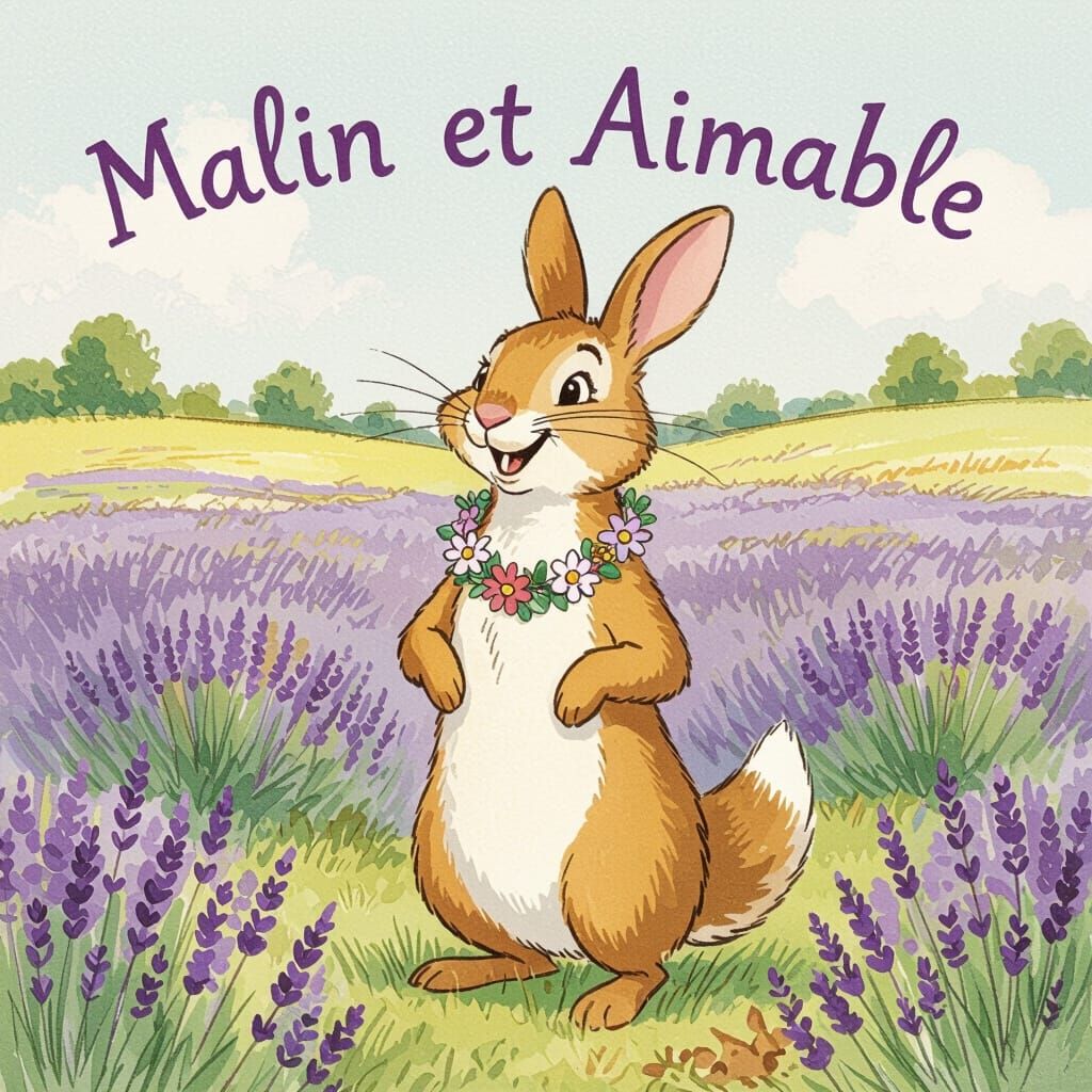 This image shows a smiling fox wearing a flower necklace in a lavender field. It's rendered in a whimsical style reminiscent of classic children's book illustrations with soft lines and pastel colors.