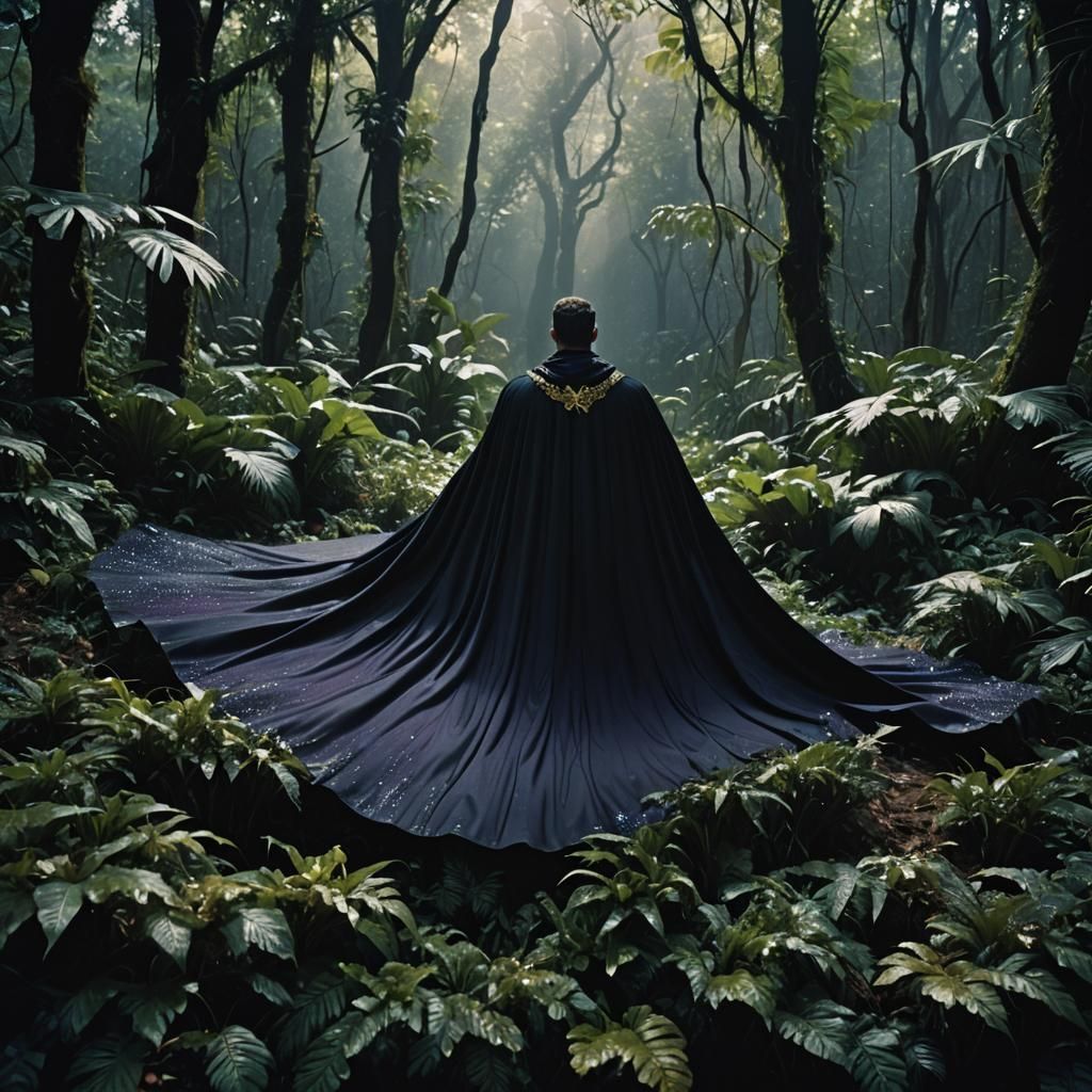A dramatic film still of a levitating black cape consuming a man above a jungle floor. Ice crystals cover the vegetation, illuminated by low-key cinematic lighting in dark blues, purples, and gold.