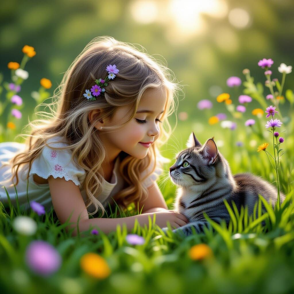 A gentle scene depicts a young girl with flowing blonde hair lying on the grass, gazing lovingly at a curious gray tabby cat. Surrounding them are delicate flowers and soft light, creating a serene atmosphere.