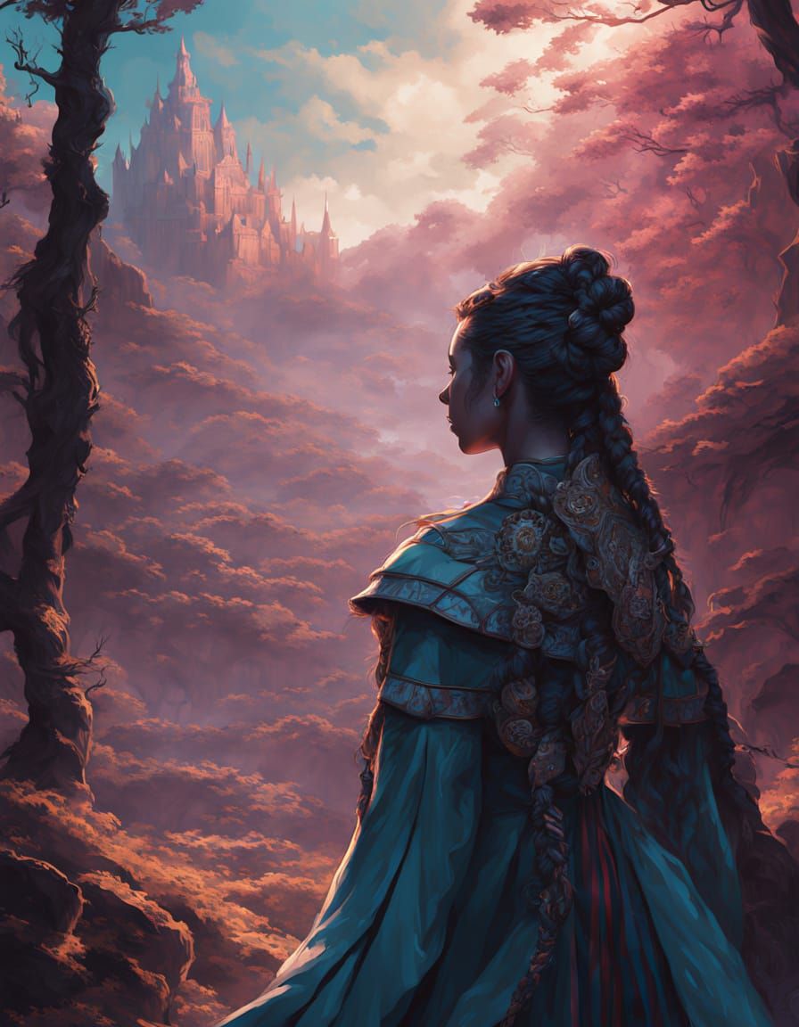 This image shows a goddess with giant ribboned braids and a shimmering gown in a psychedelic fantasy landscape. Features glowing makeup and vibrant, jewel-toned colors with deep shadows.