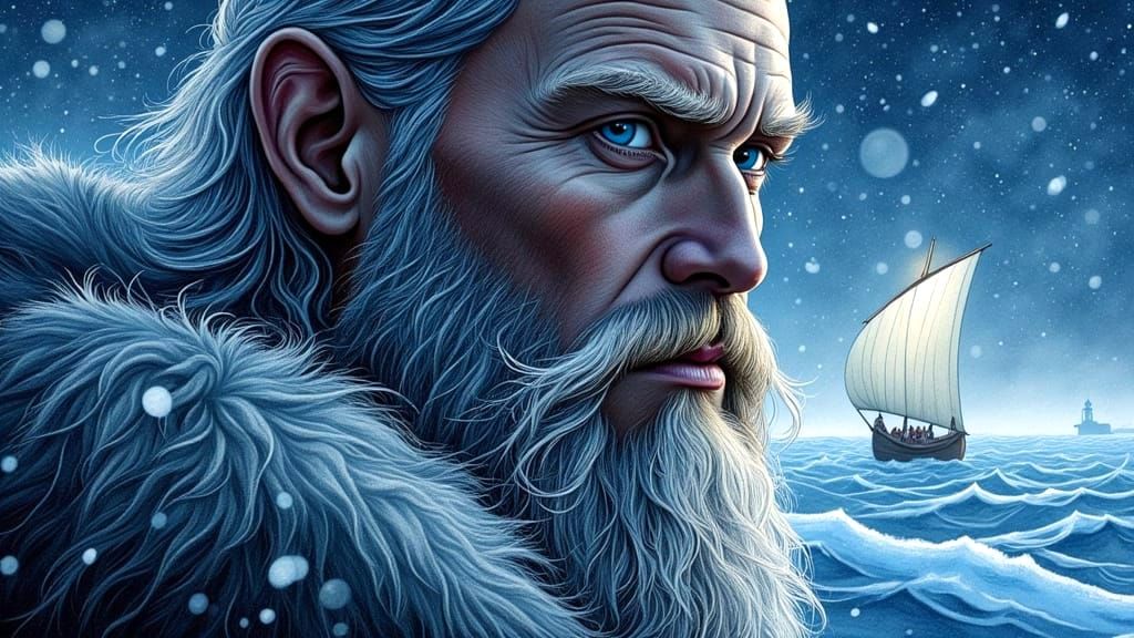 A seasoned Viking Jarl stands resolute, his face etched with a determined, stern expression. His full, dark beard and styled, possibly pulled-back hair frame the portrait. He is clad in practical, heavy, dark leather and a fur-trimmed cloak, embodying a life defined by hardship and the sea. Behind him, a longship with a red banner battles a dark, choppy sea under stormy light, highlighting the danger of his relentless voyage as an archetypal raider. โ๏ธ๐ก๏ธ๐