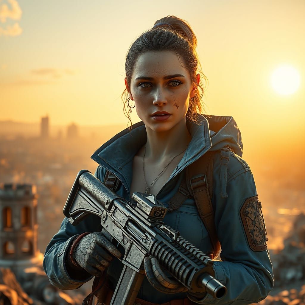 This image shows a lone woman in a torn vault suit, armed with a plasma rifle, amidst city ruins. The post-apocalyptic scene is bathed in warm, dramatic sunlight with intricate details, rendered as digital art.