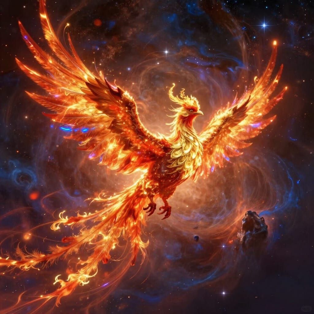 This image depicts a majestic phoenix with burning ember plumage taking flight through a vibrant cosmic nebula. Streaks of light emanate from its wings, creating a divine glow. Digital matte painting with intense detail and atmospheric effects.