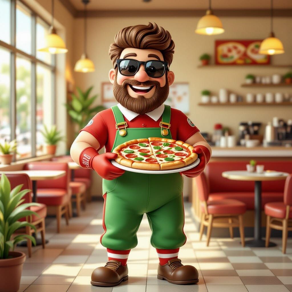 A cheerful pizza mascot in a full outfit and sunglasses, representing a restaurant. The image features vibrant colors and retro charm, inspired by classic advertising art.