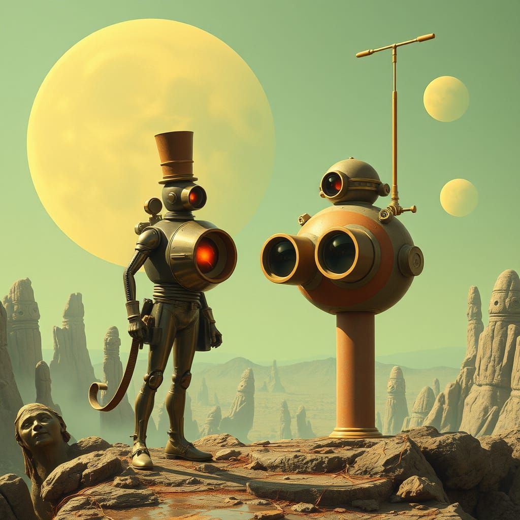 This image showcases a surreal blend of retro and futuristic elements, set in a steampunk world with a touch of bizarre science fiction.