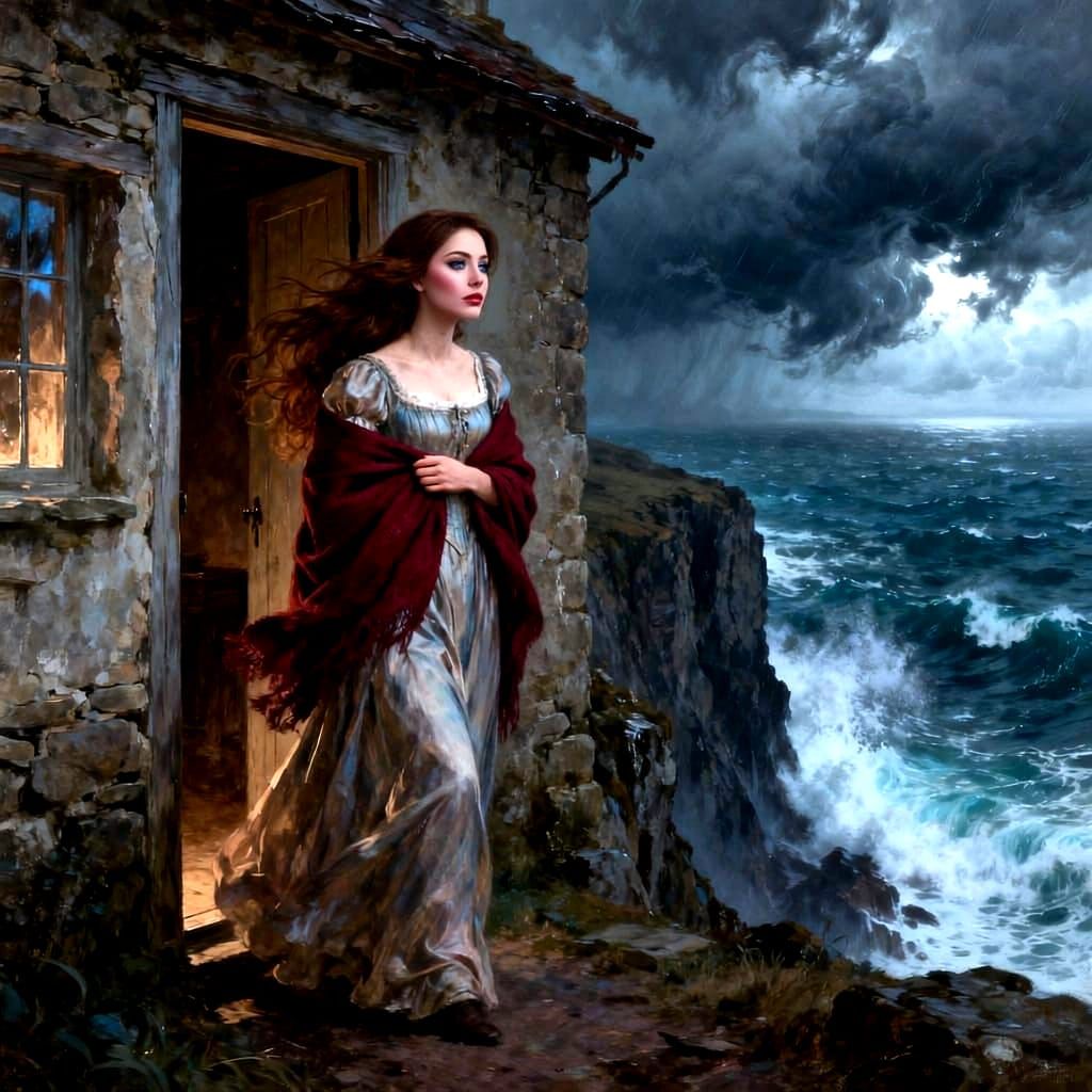 A detailed image of a woman in a flowing gown at a cottage doorway, gazing at a dramatic, stormy sea. Her expression is anxious, with wind-tousled hair and deep blue eyes reflecting the turbulent water.