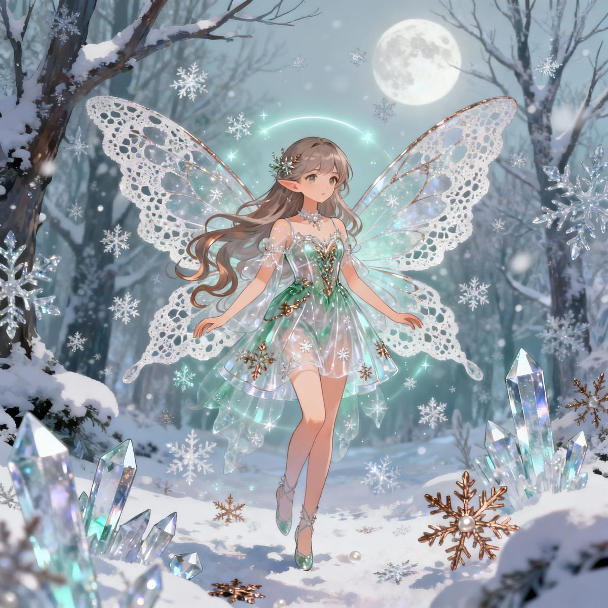 This anime manga style image features a delicate winter fairy with pearlescent, transparent elements in bronze and jade hues.