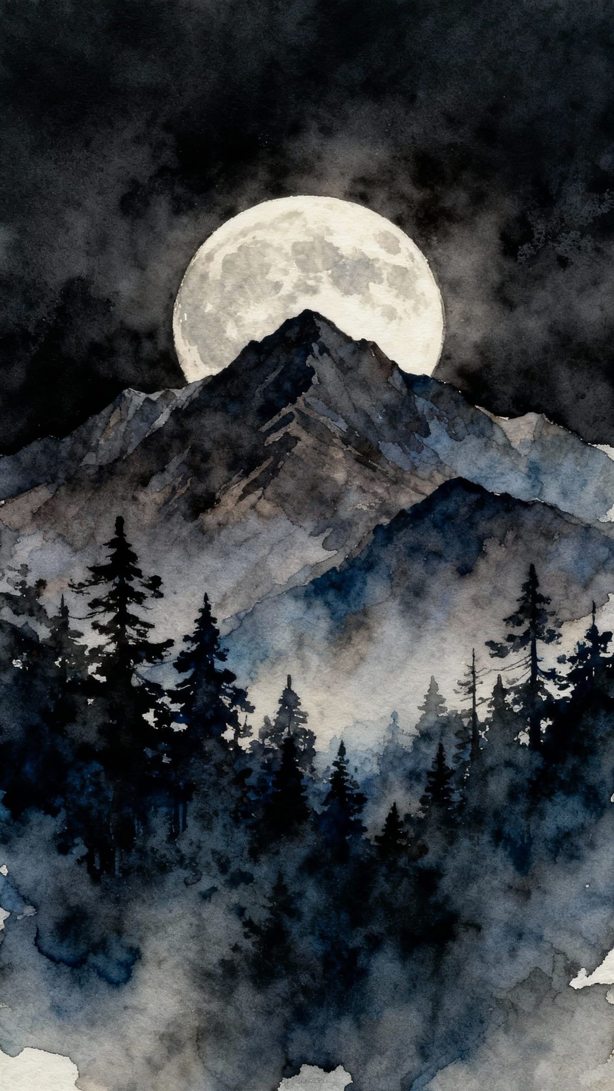 This image shows a beautiful watercolor painting of a moonrise over a dark mountain range and forest, using complementary colors for a striking effect.