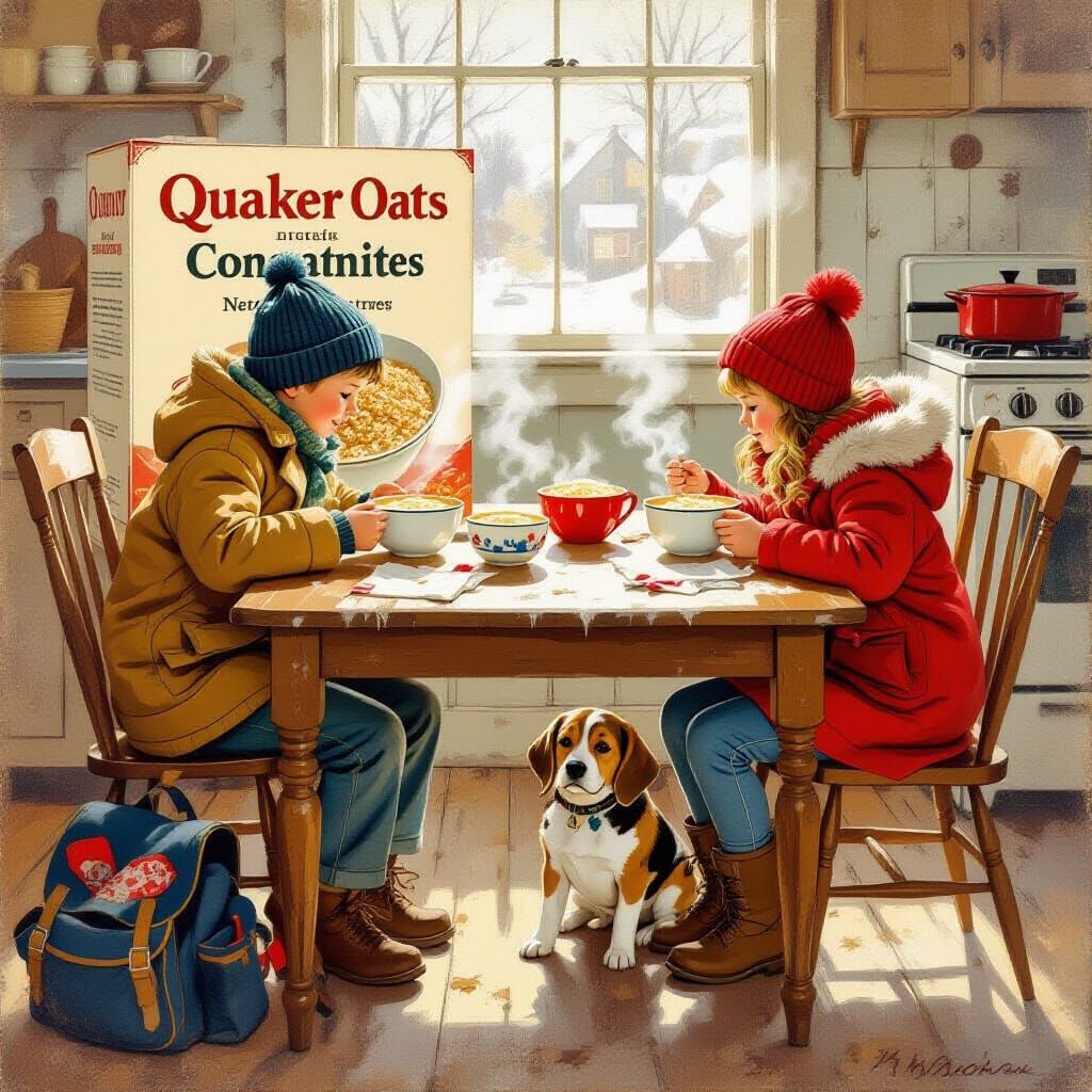 This image depicts a nostalgic breakfast scene of two children enjoying oatmeal at a vintage kitchen table. A beagle watches as steam rises from their bowls, with school bags nearby, in a warm, inviting, illustrative style.