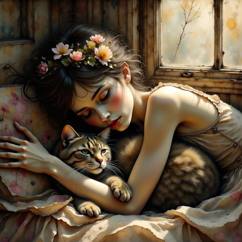 <lora:Romance:1.0> Atmospheric. Hyperrealistic. A young girl lays on her side, her head on a pillow as her cat curls up in her arms, cuddling and warm. Gentle morning light streams in, casting long shadows. Intricate details on her contemplative expression and the rustic interior. A sense of quiet peace ...