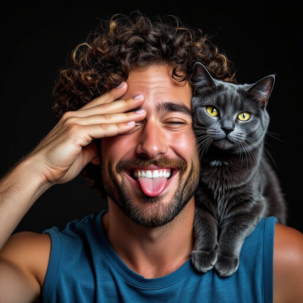 A photorealistic portrait of a man with curly hair and a blue shirt, with a gray cat playfully on his shoulder. Features studio lighting and humorous, fantasy concept art elements.