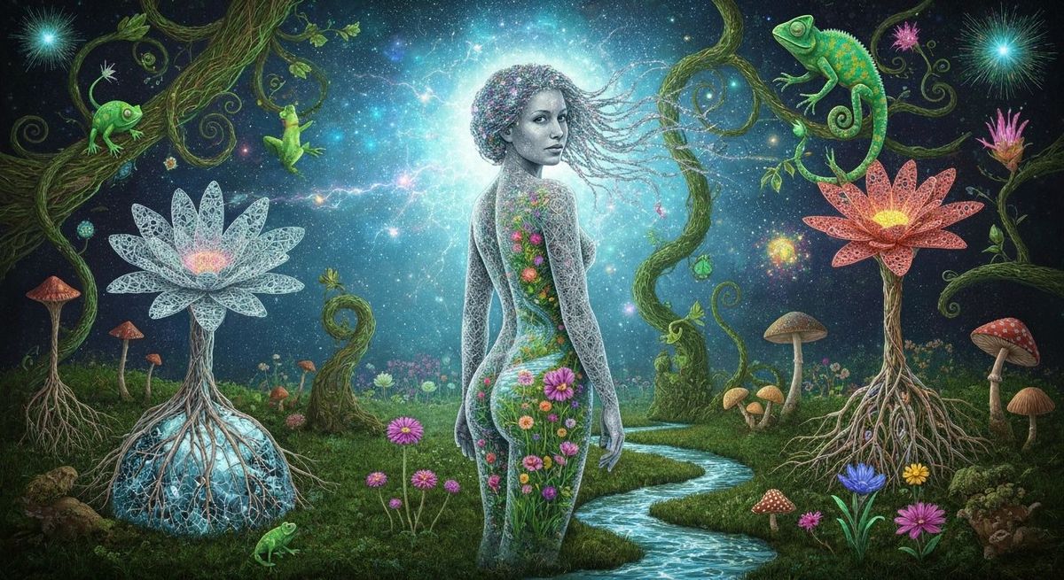 A surreal image of a woman with stardust in her hair, immersed in a garden of cosmic energy and bioluminescent plants. The scene evokes transformation and interconnectedness, presented in a vibrant, psychedelic eco-art style.