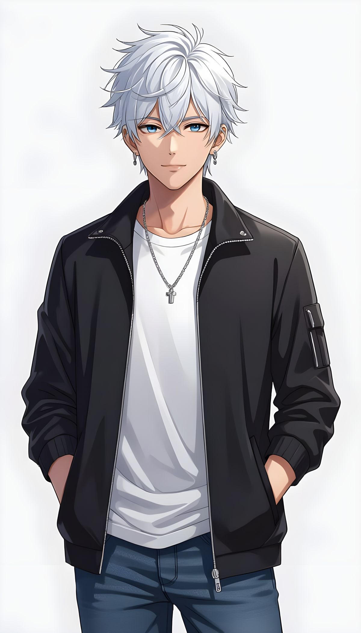 A digital anime-style illustration of a male Vtuber character. He wears a modern jacket, white t-shirt, jeans and sneakers. The character has white hair and silver accessories in a vibrant, expressive style.