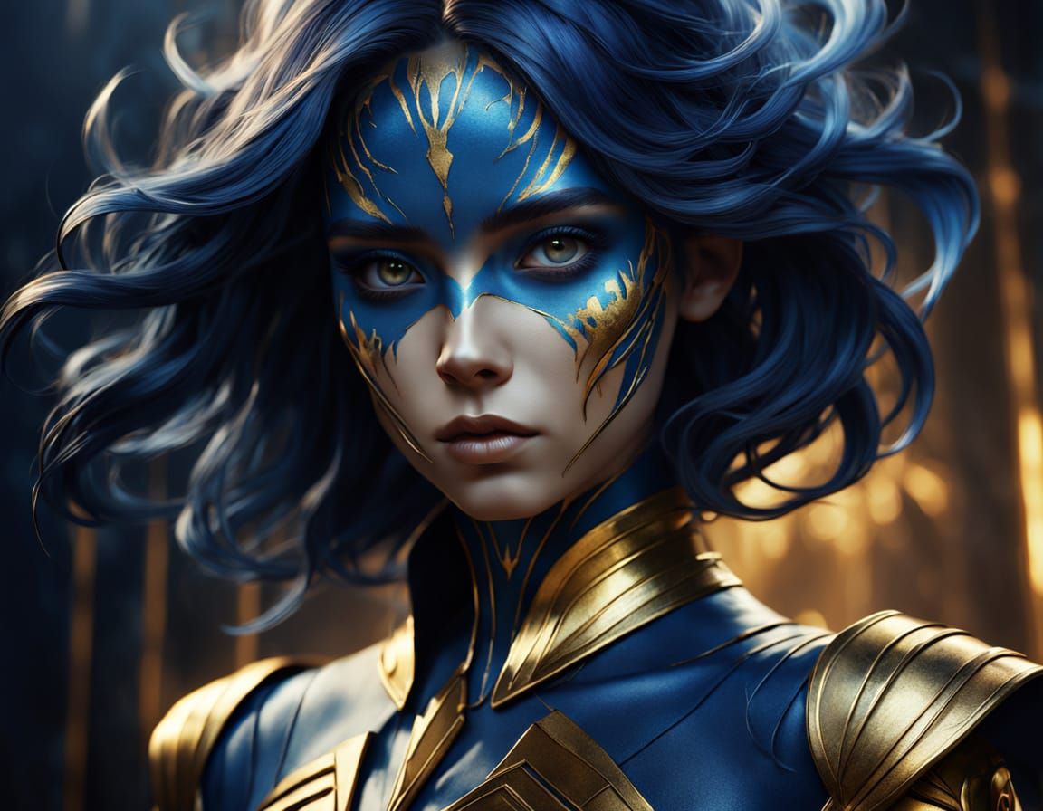 This image shows a mysterious woman with deep blue skin and golden markings, rendered in a painterly realism style with cinematic lighting and a dark aesthetic.