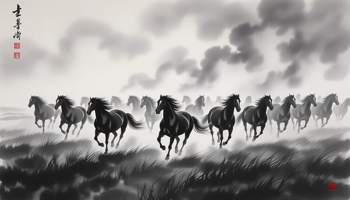 This image shows a large herd of horses running across an open landscape. The artwork is rendered in a traditional Chinese ink wash style, with flowing lines and a monochromatic palette.