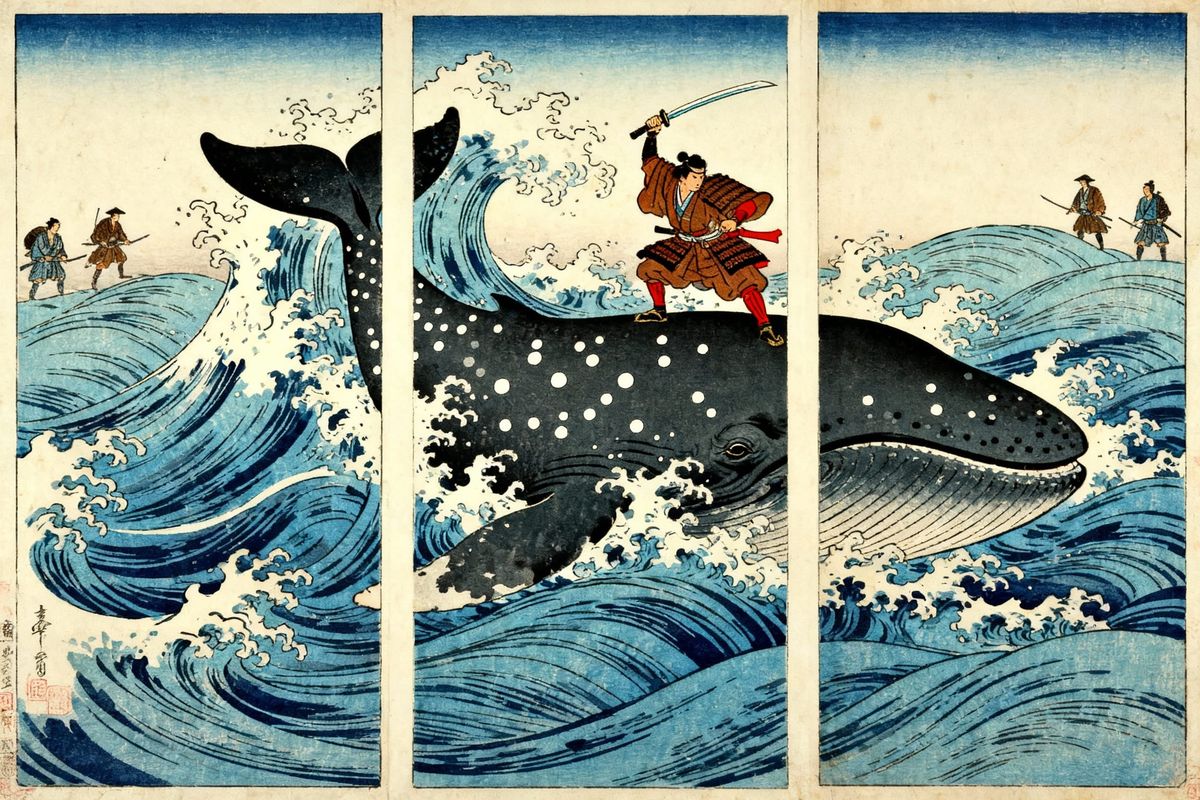 This triptych showcases a samurai battling a colossal whale in the style of Japanese woodblock prints, featuring turbulent waves and a dynamic composition with blues, whites, and blacks.