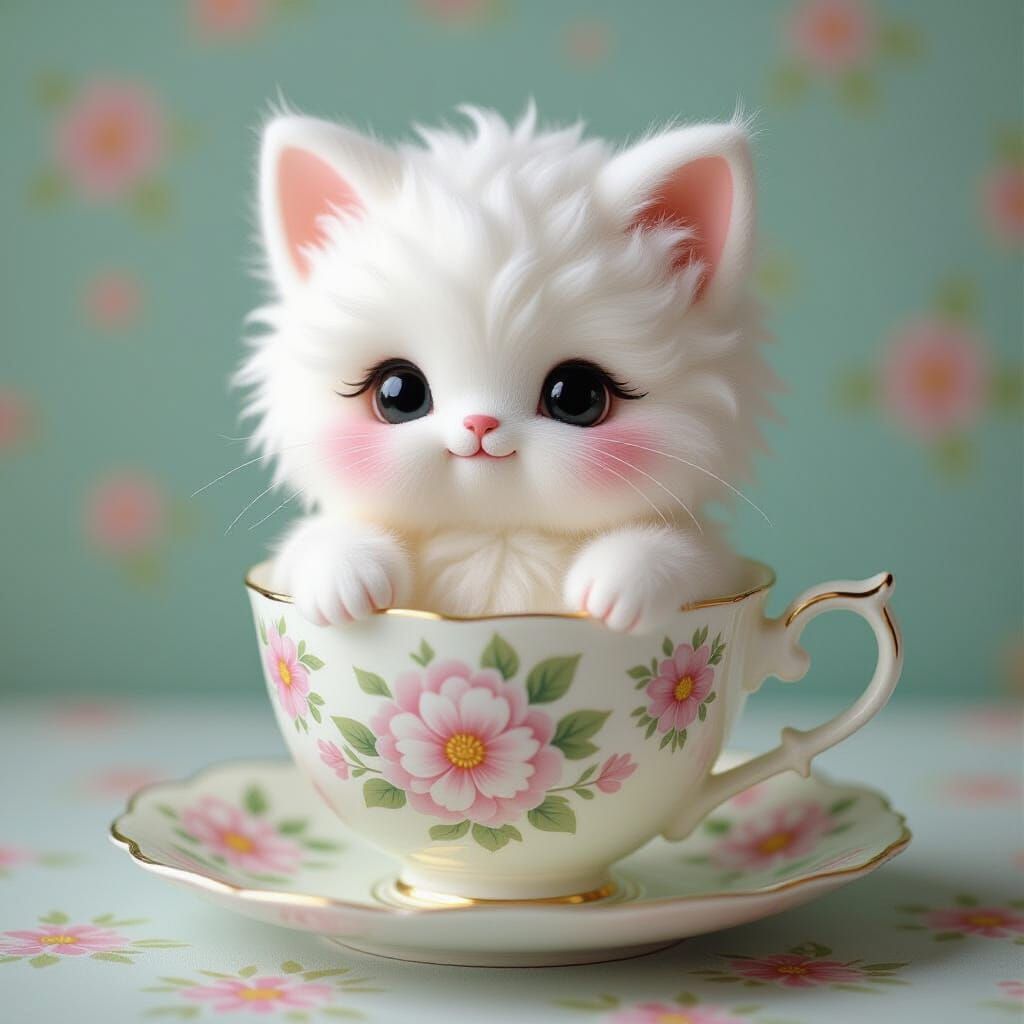 This image shows a pastel creature with soft fur in a teacup with floral patterns. The artwork has a whimsical, dreamlike aesthetic.