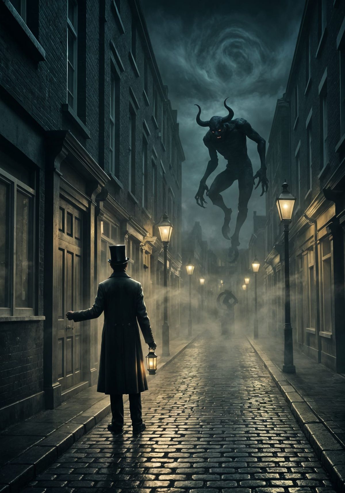This realistic painting captures a foggy 1850s London alleyway illuminated by gas lamps and a lantern. A Victorian gentleman stands guard as a massive demonic shadow looms in the mist.