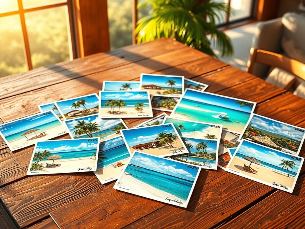 This image displays a collection of colorful summer vacation postcards featuring beaches and palm trees, arranged on a rustic table. The scene evokes a nostalgic feel with warm sunlight, rendered in a detailed, photorealistic concept art style.