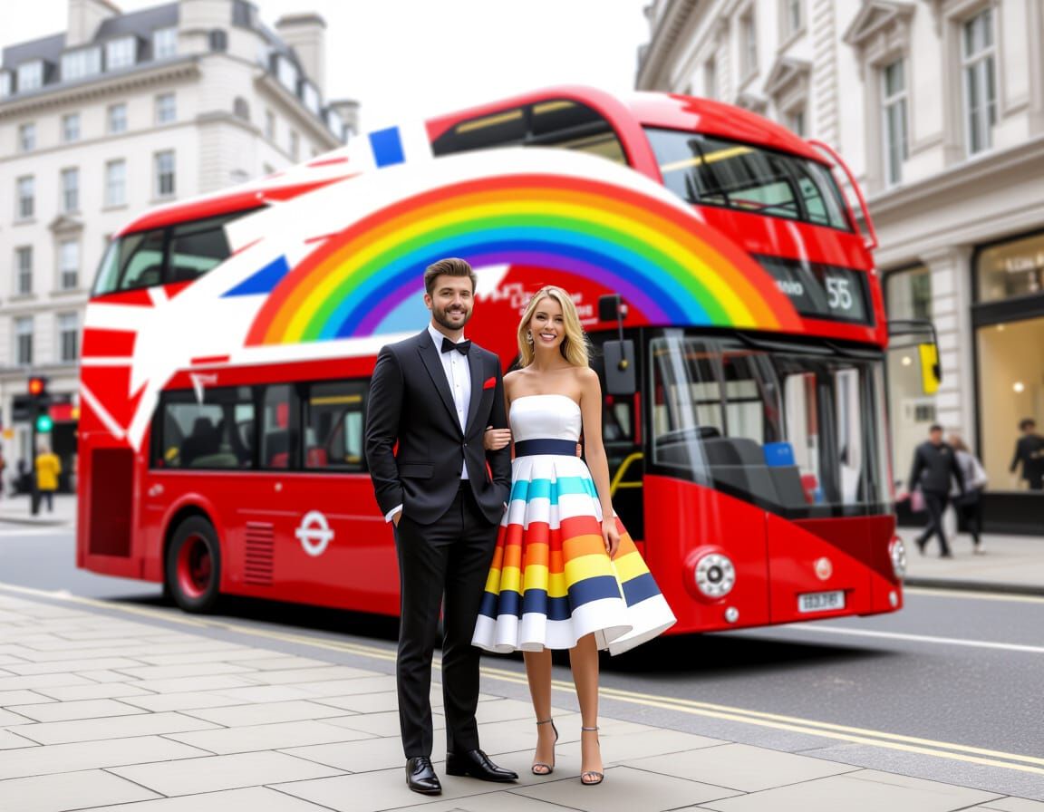 This image shows an elegant couple in a sunny, multicolored London setting. The AI has generated a vibrant and cheerful scene.
