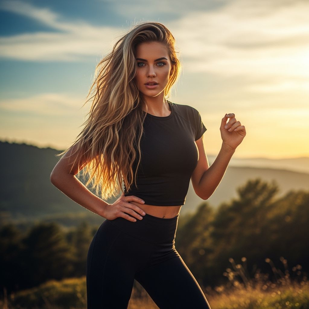 This image shows a confident young woman with blonde hair and blue eyes in athletic wear, posing outdoors. Soft hills and a sunset create a vibrant backdrop, with rich colors and atmospheric perspective.
