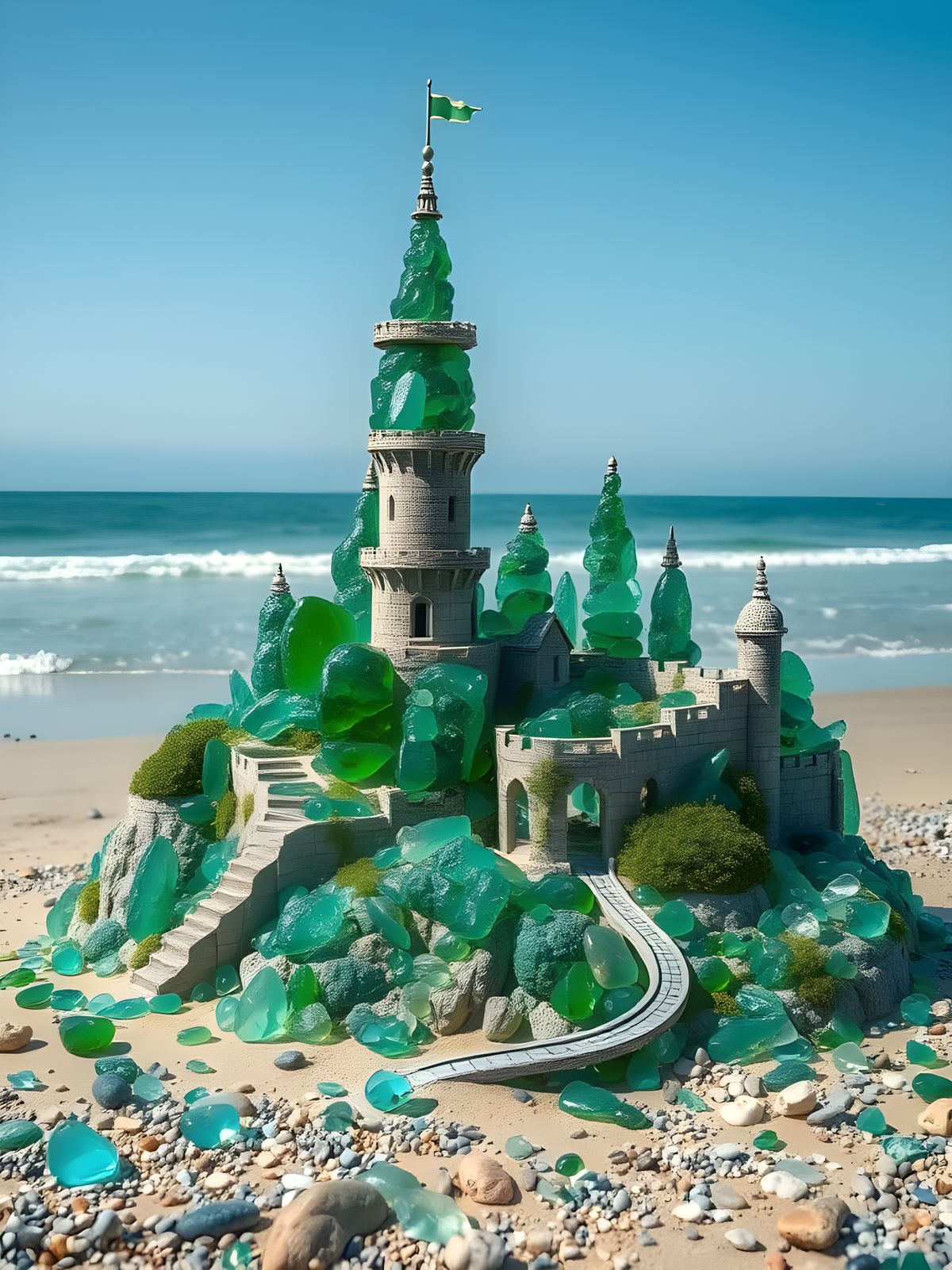 This hyperdetailed artwork showcases a stunning sculpture of an Emerald City on a beach, crafted from green and turquoise sea glass, featuring towers, castles, bridges, and roads.