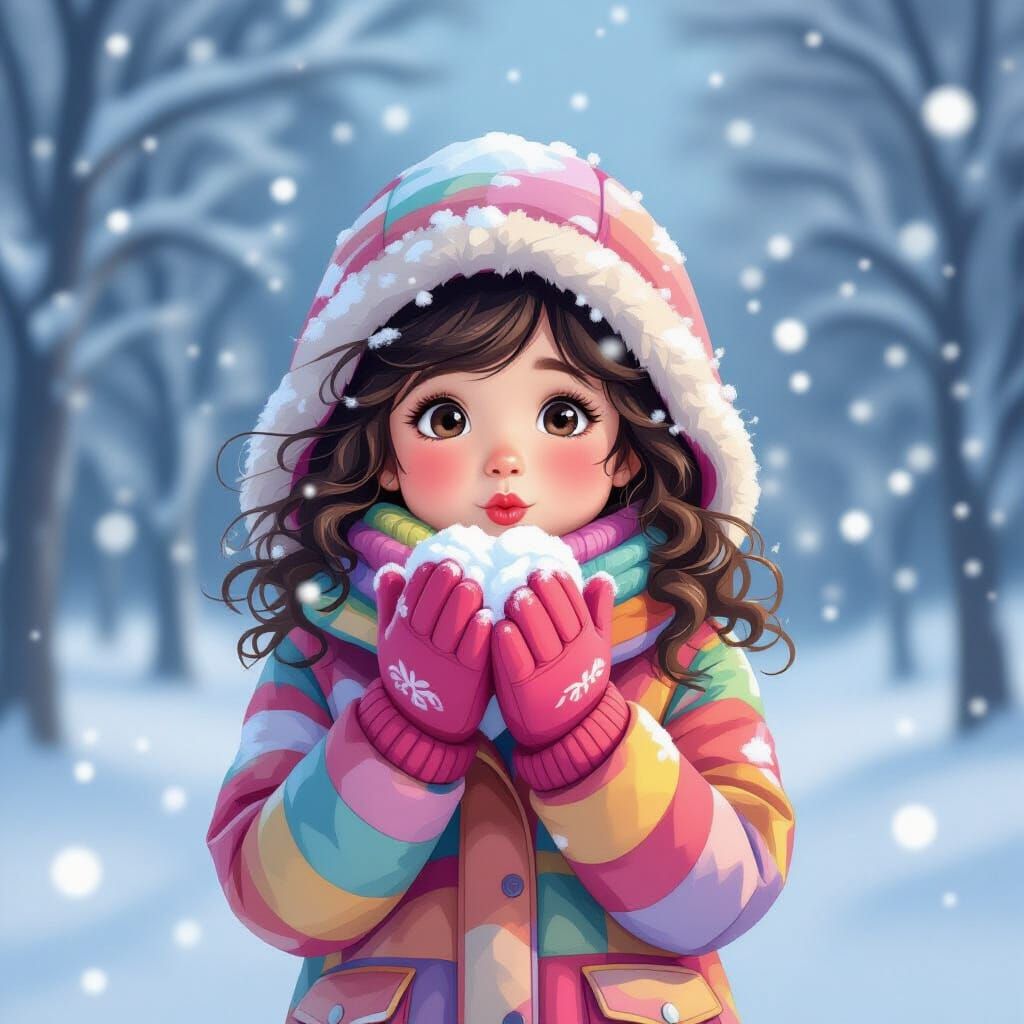 A sweet, high-quality image of a cute little girl with dark curly hair in a colorful hooded winter jacket, blowing snow off her hands. Front view captures her warm winter attire.