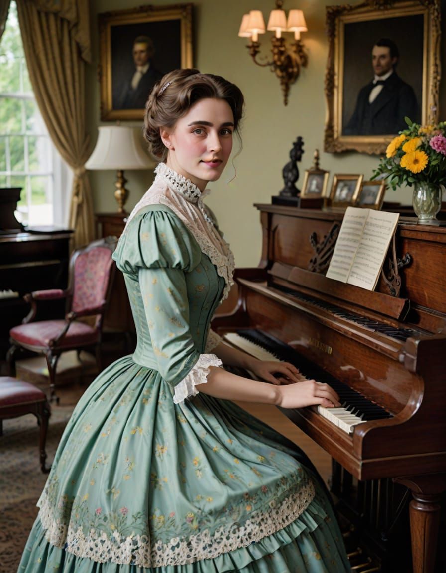 This image shows a young woman in a beautiful Victorian day dress playing the piano in a cozy parlor setting. The scene is rendered in a traditional style with attention to period detail.