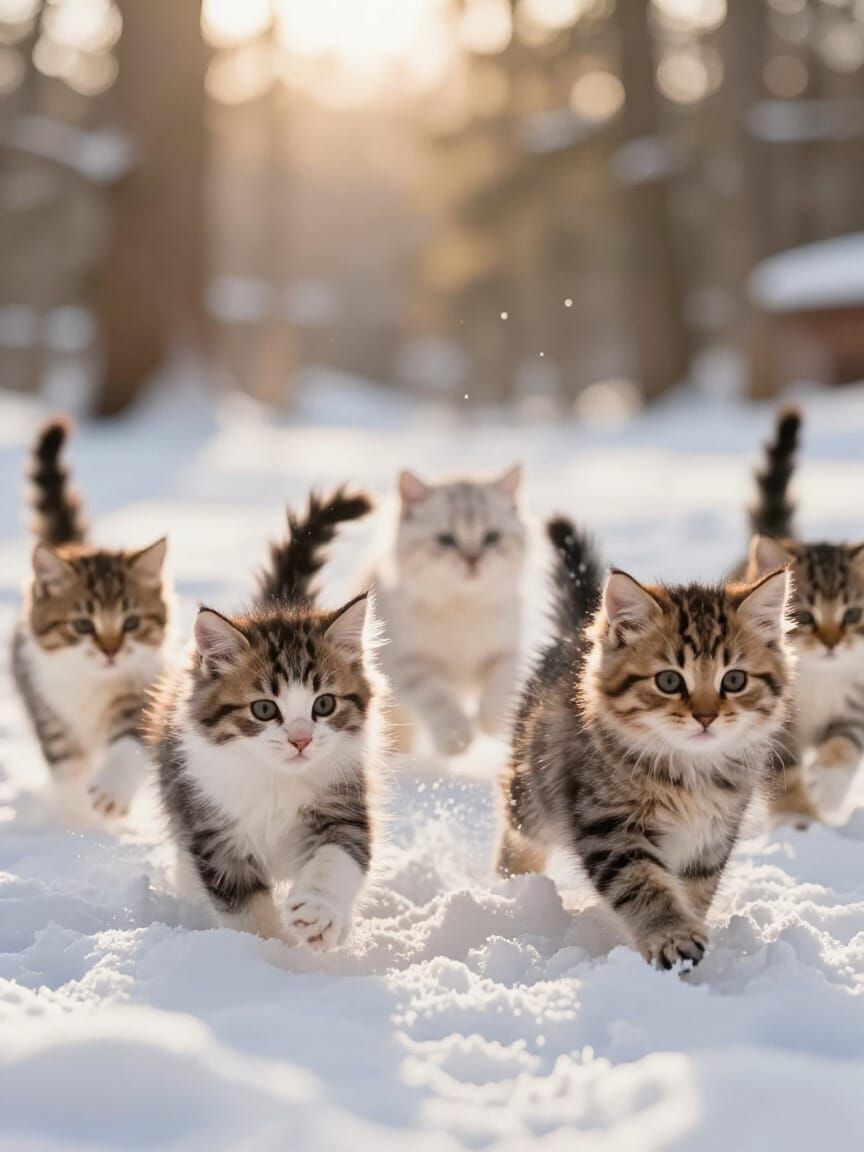 This image shows fluffy kittens playing in the snow with warm sunlight filtering through trees. Photorealistic and heartwarming, it features bokeh and natural lighting for a cinematic feel.