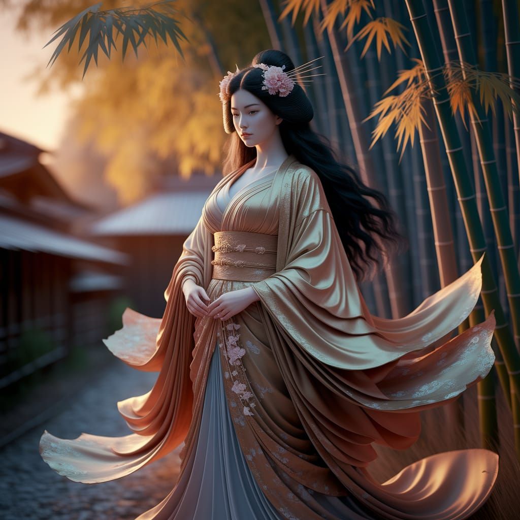 This image shows a Japanese Goddess in flowing gold robes within a bamboo forest at sunset. Rendered with vivid colors and intricate detail, it evokes a photorealistic concept art style.