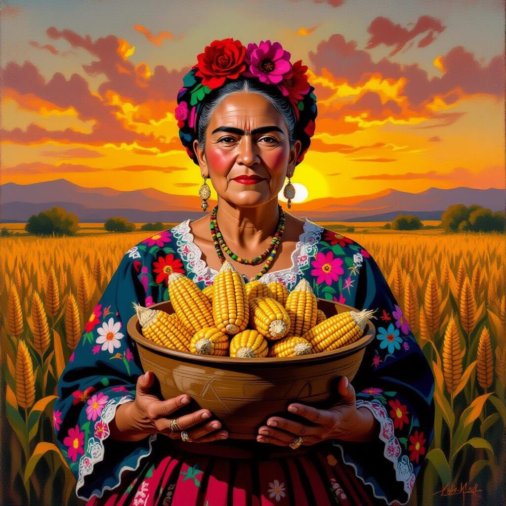 This image shows a ninety-year-old goddess in traditional Mexican attire holding corn. The scene is set in the Rio Grande Valley at sunset and rendered with vibrant brushstrokes and earthy tones.